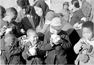 한국전쟁 중 어린이들에게 주먹밥을 나눠주는